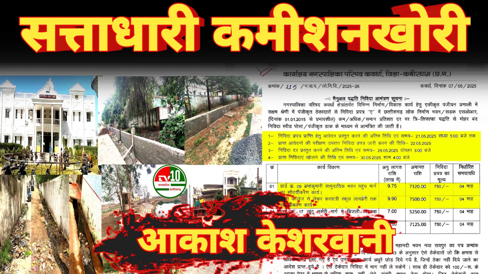 कार्यालय कवर्धा नगर पालिका ने सूचना में यह भी अंकित किया गया कि निविदा प्रपत्र प्राप्ति हेतु आवेदन प्रस्तुत करने की अंतिम तिथि एवं समय 21 मई 2025 संध्या 5.00 बजे तक, प्राप्त आवेदनों का परीक्षण उपरांत निविदा प्रपत्र जारी करने की तिथि 22 मई 2025, निविदा दर प्रस्तुत करने की अंतिम तिथि एवं समय- 29 मई 2025 दोपहर 3.00 बजे तक तथा प्राप्त निविदाएं खोलने की तिथि एवं समय 30 मई 2025 समय शाम 4.00 निर्धारित की गई है। लेकिन सच ये है कि इनमें से वार्ड क्रमांक 9 में ब्रम्हकुमारी सामुदायिक भवन पहुंच मार्ग का सौंदर्यीकरण अनुमानित लागत 9.75 लाख रूपए का निर्माण कार्य तथा पीजी कॉलेज से लेकर करपात्री स्कूल लायब्रेरी तक सौंदर्यीकरण कार्य अनुमानित लागत 9.75 लाख रूपए, निविदा खुलने से पूर्व ही नगर पालिका द्वारा अपने चहेते ठेकेदार को दे दिया गया। इतना ही नहीं संबंधित ठेकेदार ने बगैर वर्क आर्डर के ही बिना देरी किए लगभग 50 प्रतिशत कार्य पूर्ण भी कर दिया है। बताया जाता है कि यह पहला या दूसरा निर्माण कार्य नहीं है जो बगैर निविदा खोले प्रारंभ किया गया हो, इससे पूर्व भी भाजपा शासन काल में नगर पालिका परिषद कवर्धा द्वारा कई निर्माण व विकास कार्य बगैर निविदा खोले धड़ल्ले से कमीशन लेकर अपने चाहते ठेकेदारों को दिए और कराए जा चुके है। अब पालिका प्रशासन द्वारा यह किसके कहने पर और किस मंशा से किया जा रहा है यह जांच का विषय है। लेकिन इतना तय है कि भाजपा के राज में कवर्धा नगर पालिका में नगरवासियों की सुख, सुविधा तथा नगर विकास के लिए शासन द्वारा स्वीकृत किए जा रहे विकास एवं निर्माण कार्यो में जमकर कमीशनखोरी और भ्रष्टाचार का खेल खेला जा रहा है। हैरानी की बात यह है कि यह सब नगरवासियों को दिव्य और भव्य कवर्धा नगर बनाने का सपना दिखाकर प्रदेश के उपमुख्यमंत्री के गृह नगर में धड़ल्ले से चल रहा है। ऐसे में बड़ा सवाल यही उठता है कि अक्सर प्रशासनिक तथा विभागीय बैठकों तथा विकास एवं निर्माण कार्यो के निरीक्षण के दौरान भ्रष्टटाचार को बर्दास्त न करने और भ्रष्टाचारियों पर सख्त कार्यवाही की गीदड़ भभकी देने वाले कवर्धा विधायक व प्रदेश के उप मुख्यमंत्री मौन क्यों है?