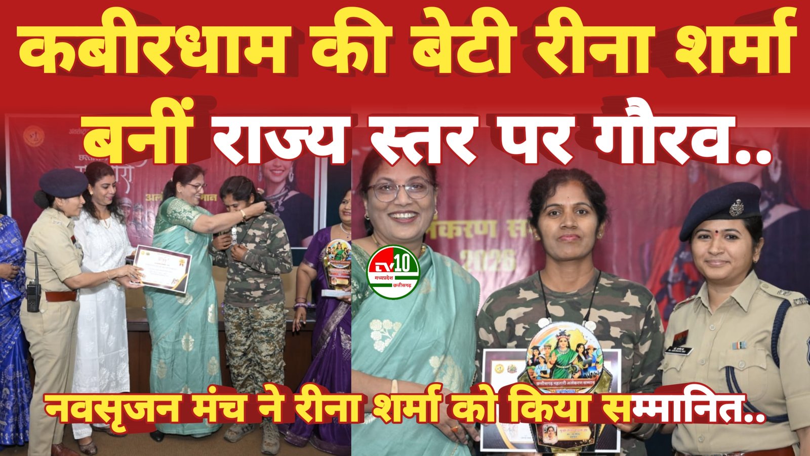 रविवार शाम रायपुर के वृंदावन हॉल, सिविल लाइन में आयोजित इस कार्यक्रम में प्रदेश के विभिन्न क्षेत्रों में उत्कृष्ट कार्य कर रही 51 महिलाओं को सम्मानित किया गया। इस दौरान कबीरधाम जिले की बेटी रीना शर्मा को उनके समाज, महिला सशक्तिकरण एवं देशहित में किए गए सराहनीय कार्यों के लिए विशेष रूप से सम्मानित किया गया।
