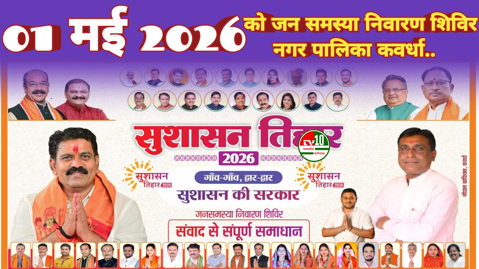 कवर्धा:- सुशासन तिहार के तहत नगर पालिका परिषद कवर्धा द्वारा 01 मई 2026 को जन समस्या निवारण शिविर का आयोजन किया जा रहा है। यह शिविर वीर सावरकर भवन में प्रातः 10 बजे से दोपहर 3 बजे तक आयोजित होगा।