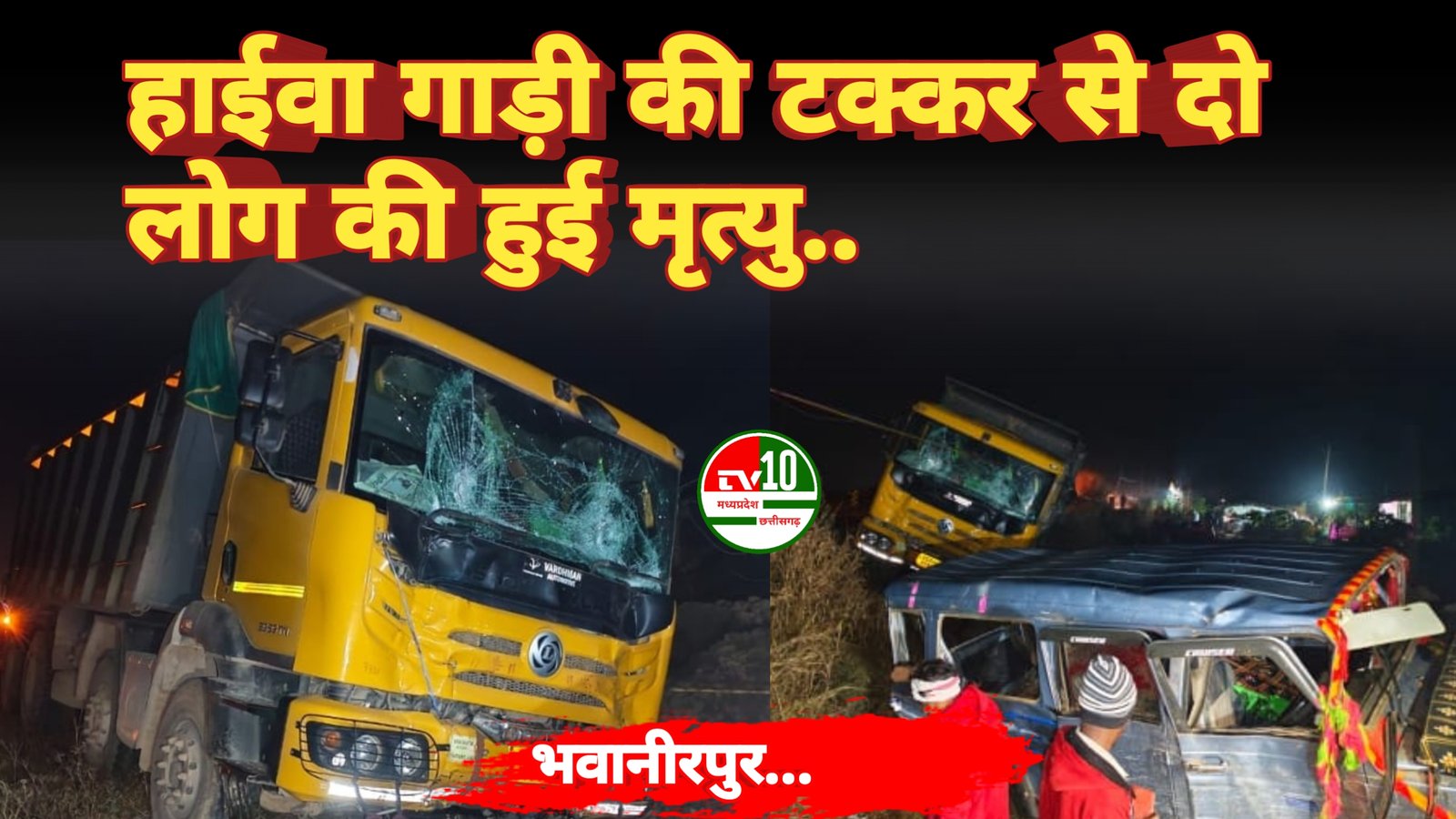 मुकेश झा भवानीरपुर ::- पुलिस थाना गिधपुरी के अंतर्गत ग्राम खपरी भ के पास पलारी से आरंग मेन रोड पर रात्रि लगभग 11:00 बजे क्लोजर गाड़ी को हाईवा गाड़ी ने मारी टक्कर जिससे दो लोग का मृत्यु और 9 लोग घायल प्राप्त जानकारी थाना प्रभारी संदीप बंजारे ने बताया कि उपस्थित होकर कहा कि ग्राम तेलासी निवासी संतराम कमल पिता जतीराम कमल उम्र 52 वर्ष ।